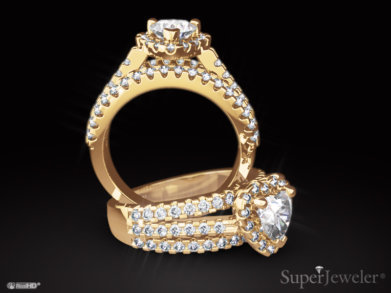 For a classically beautiful diamond engagement ring, try this engagement ring crafted in 14 karat yellow gold. This ring boasts a 1 carat clarity enhanced heart shaped center surrounded by a halo of diamonds. The ring has a total diamond weight of 1.64 carats. There are 65 diamonds total in I-J color and I1-I2 clarity.