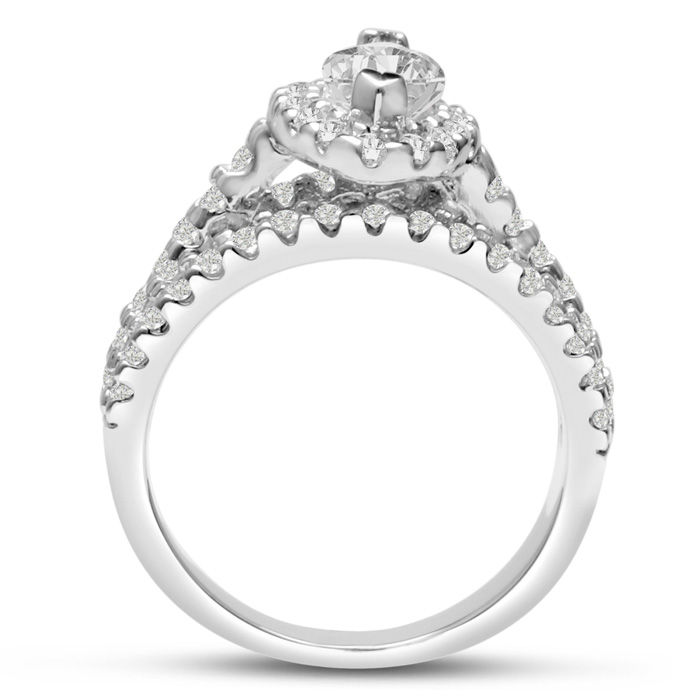 For a classically beautiful diamond engagement ring, try this engagement ring crafted in 14 karat white gold. This ring boasts a 1 carat marquise center surrounded by a halo of diamonds. The ring has a total diamond weight of 1.66 carats. There are 67 diamonds total in H-I color and SI2-I1 clarity.