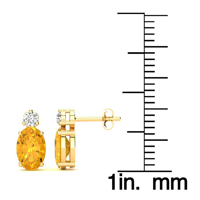 These stunning gemstone and diamond earrings feature two 7x5mm oval shape citrine gemstones at 1.60 carats. The gemstones are accented with two sparkling diamonds in a in I-J color, SI2-I1 clarity at 0.06 carats. Total gem weight is 1.66 carats. These earrings are crafted in 14 karat yellow gold and come with comfortable and secure post with friction backs.
