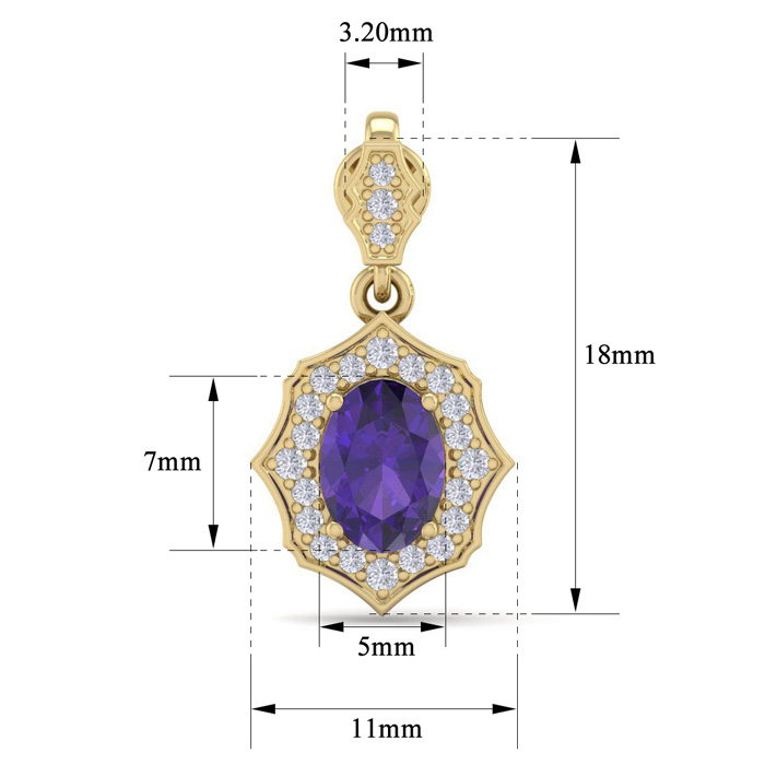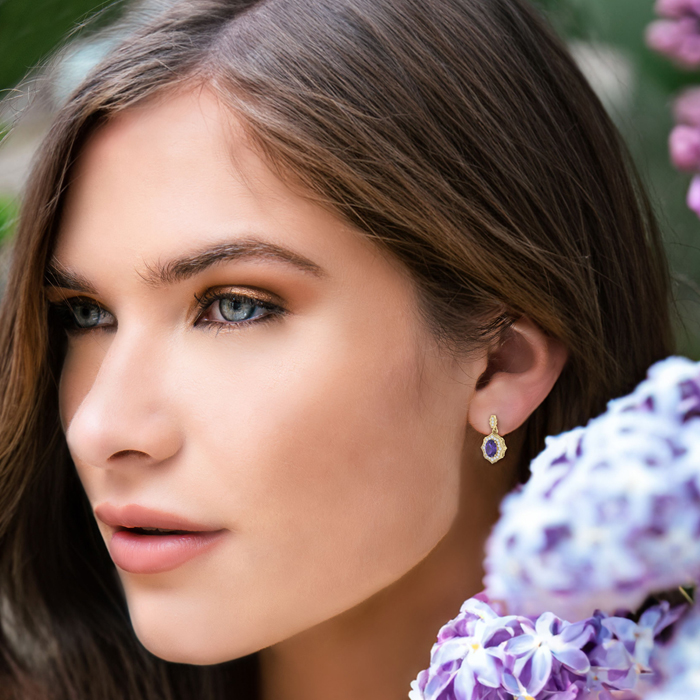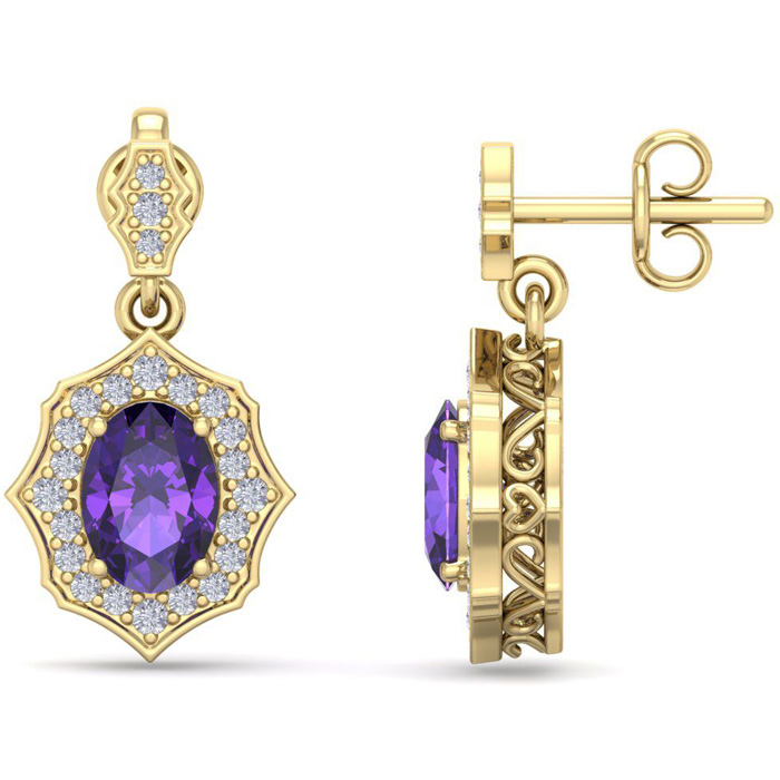These elegant gemstone earrings feature two 7x5mm oval shape amethyst gemstones at approximately 1.40 carats. They are surrounded by 46 sparkling diamonds in I-J color, I1-I2 clarity at 1/4 carat total weight. Total gem weight is approximately 1 2/3 carat total weight. These earrings are in 14 karat yellow gold and have comfortable and secure friction backs. Each earring dangles down 3/4 inch.