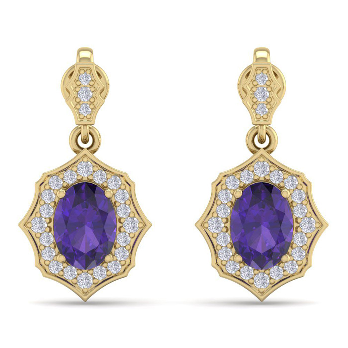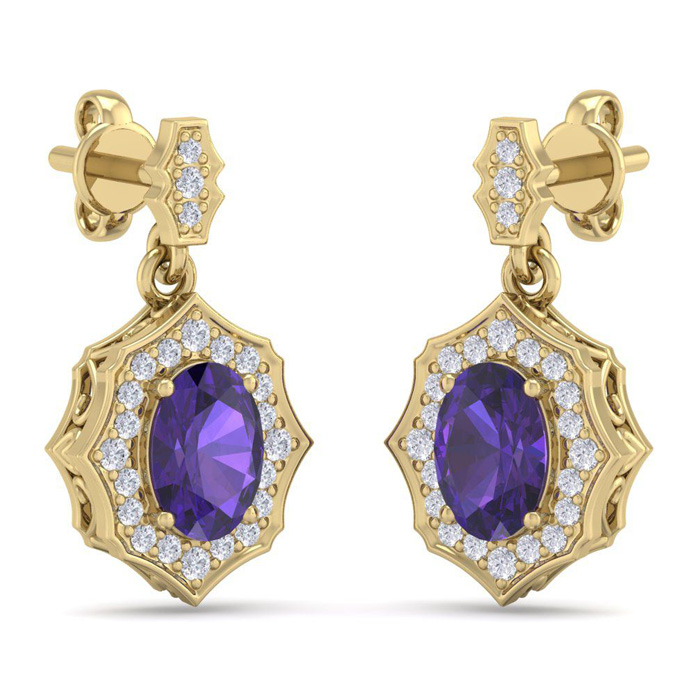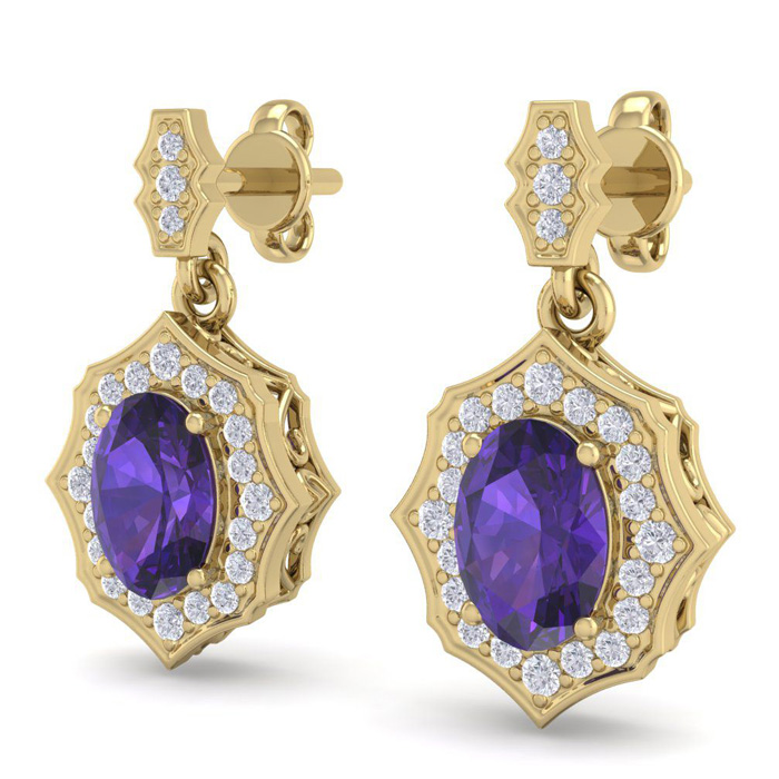 1 2/3 Carat Oval Shape Amethyst and Diamond Dangle Earrings In 14 Karat Yellow Gold