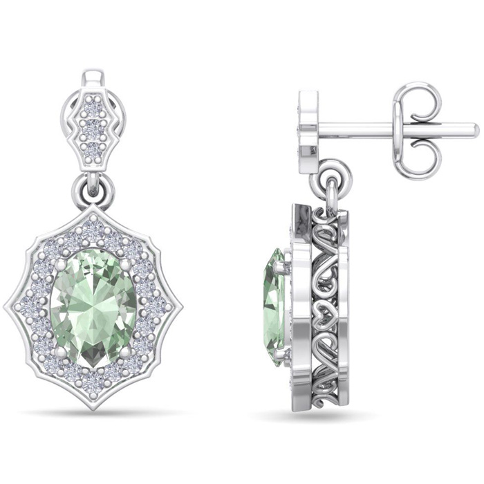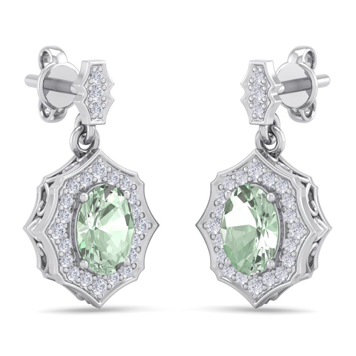 Retrograde Birthstones™ 1 2/3 Carat Oval Shape Green Amethyst and Diamond Dangle Earrings In 14 Karat White Gold