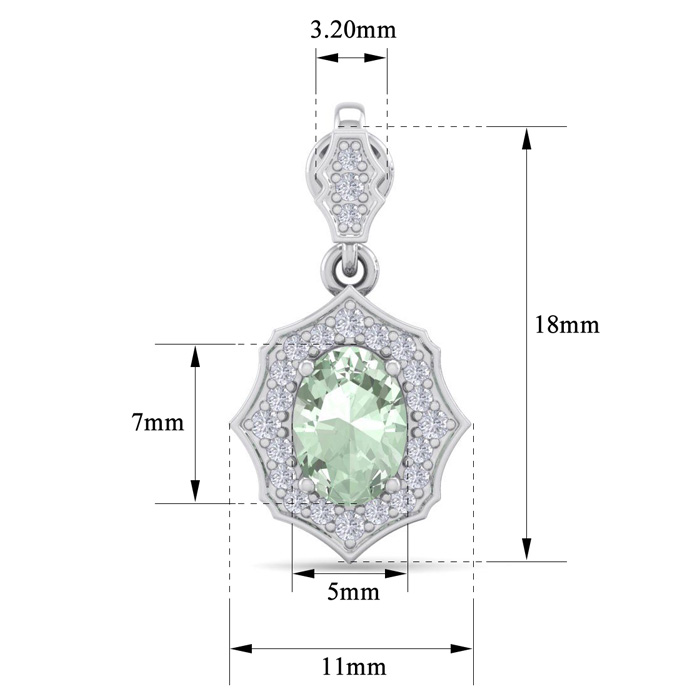 These elegant gemstone earrings feature two 7x5mm oval shape green amethyst gemstones at approximately 1.40 carats. They are surrounded by 46 sparkling diamonds in I-J color, I1-I2 clarity at 1/4 carat total weight. Total gem weight is approximately 1 2/3 carat total weight. These earrings are in 14 karat white gold and have comfortable and secure friction backs. Each earring dangles down 3/4 inch. *Retrograde Birthstones™ flips the idea of traditional birthstones. Wear your ½ birthday birthstone, your Retrograde Birthstone, “The Birthstone For Your Bad Side™.