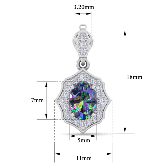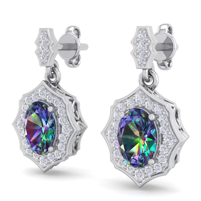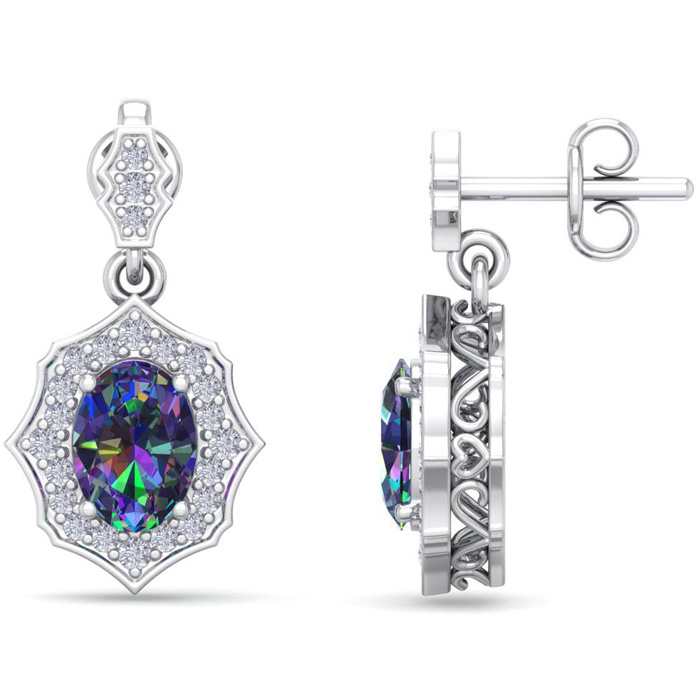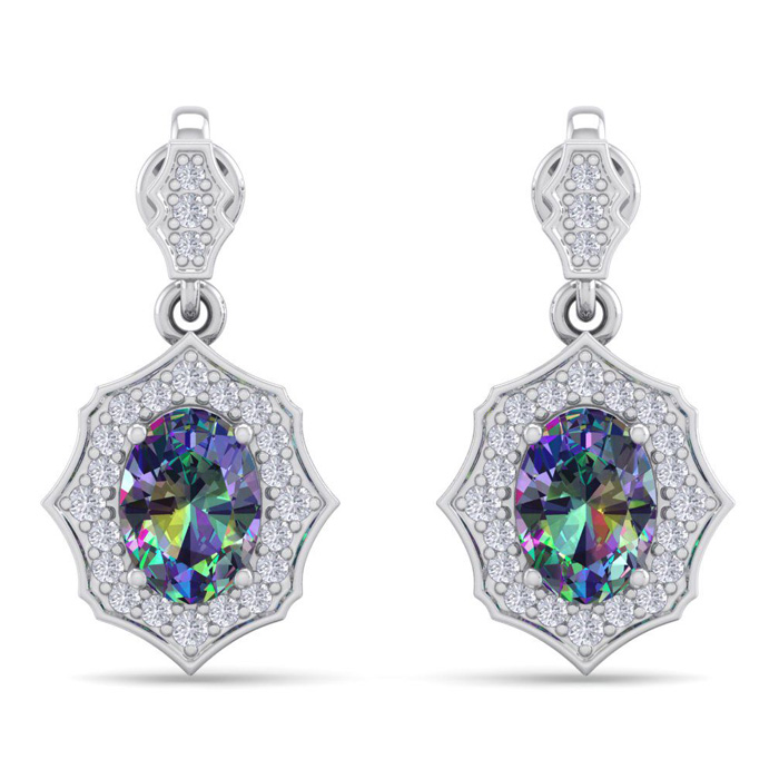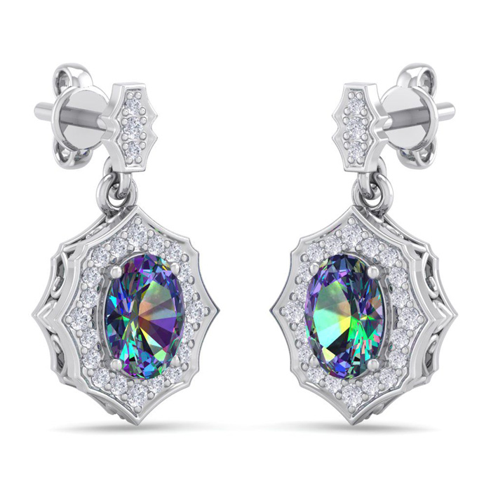 These elegant gemstone earrings feature two 7x5mm oval shape mystic topaz gemstones at approximately 1.40 carats. They are surrounded by 46 sparkling diamonds in I-J color, I1-I2 clarity at 1/4 carat total weight. Total gem weight is approximately 1 2/3 carat total weight. These earrings are in 14 karat white gold and have comfortable and secure friction backs. Each earring dangles down 3/4 inch. *Retrograde Birthstones™ flips the idea of traditional birthstones. Wear your ½ birthday birthstone, your Retrograde Birthstone, “The Birthstone For Your Bad Side™.
