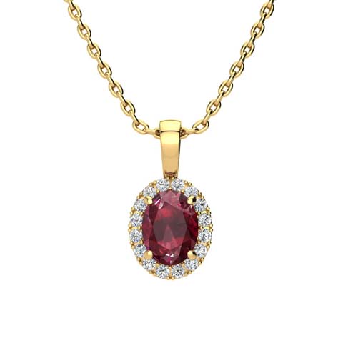 1 2/3 Carat Oval Shape Ruby and Halo Diamond Necklace In 14 Karat Yellow Gold With 18 Inch Chain
