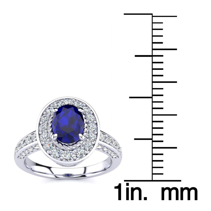 This stunning gemstone and halo diamond ring features one 7x5mm oval shape sapphire gemstone at 1.00 carats. It is surrounded by 71 sparkling diamonds in a halo and down the band in I-J color, I1-I2 clarity at 0.68 carats. Total gem weight is 1.68 carats. This ring is crafted in 14 karat white gold.