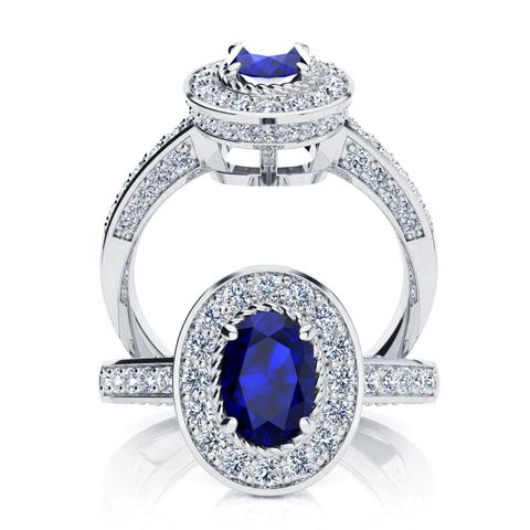 1 2/3 Carat Oval Shape Sapphire and Halo Diamond Ring In 14 Karat White Gold