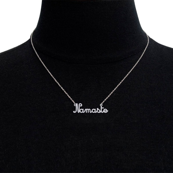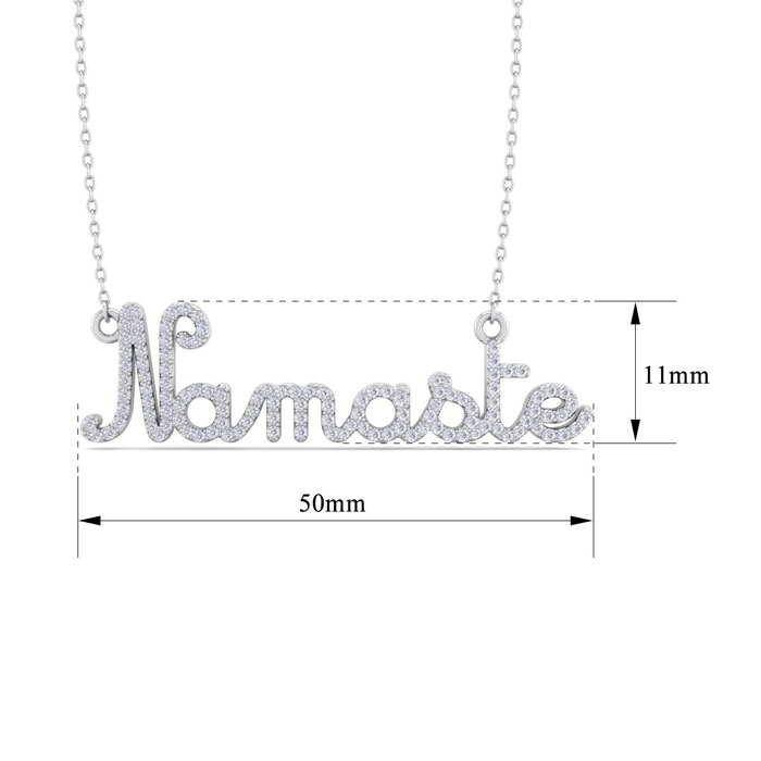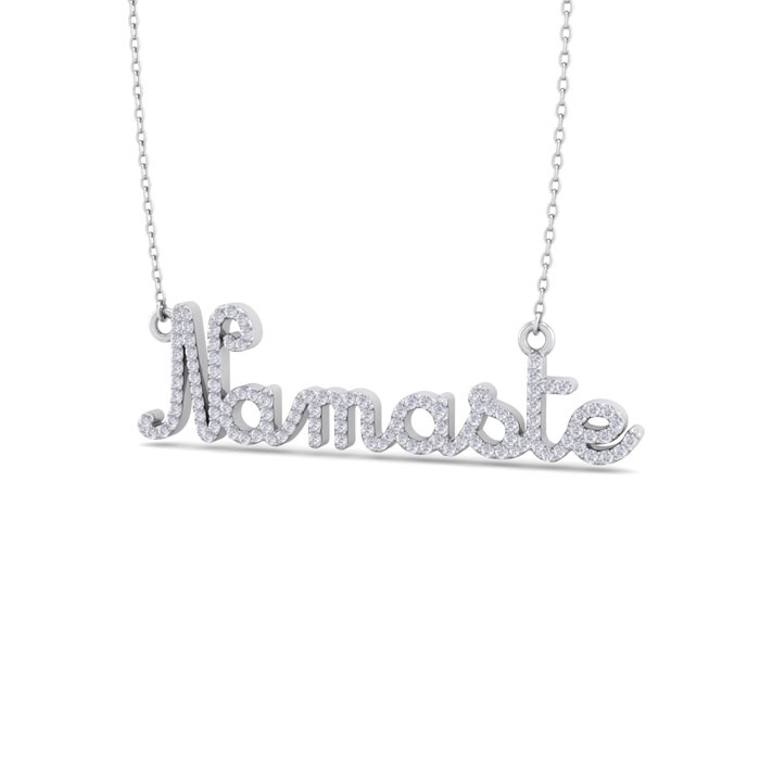 This elegant diamond necklace features 119 sparkling diamonds adorning the word Namaste. Total carat weight is approximately 1/2 carat. Diamond color is I-J, diamond clarity I1-I2. This necklace is in 14 karat white gold and comes with a 16 inch cable chain with a spring ring clasp. The pendant measures two inches long and 1/2 inch wide.