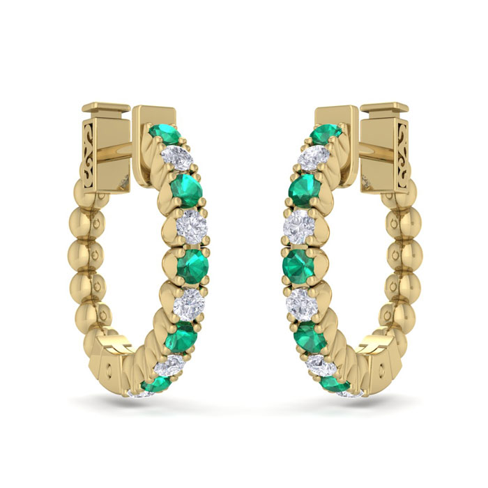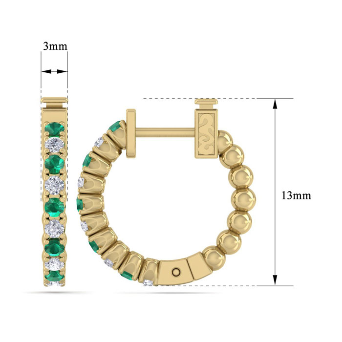 1/2 Carat Emerald and Diamond Hoop Earrings In 14 Karat Yellow Gold, 1/2 Inch