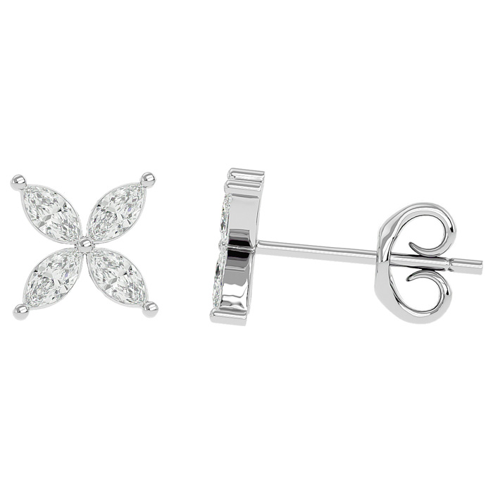 These classic diamond stud earrings feature eight 4x2mm marquise shape diamonds in H-I color, SI2-I1 clarity. Each diamond weighs approximately 0.06 carats for a total weight of approximately 1/2 carat. These earrings are in 14 karat white gold and have comfortable and secure post with friction backs.