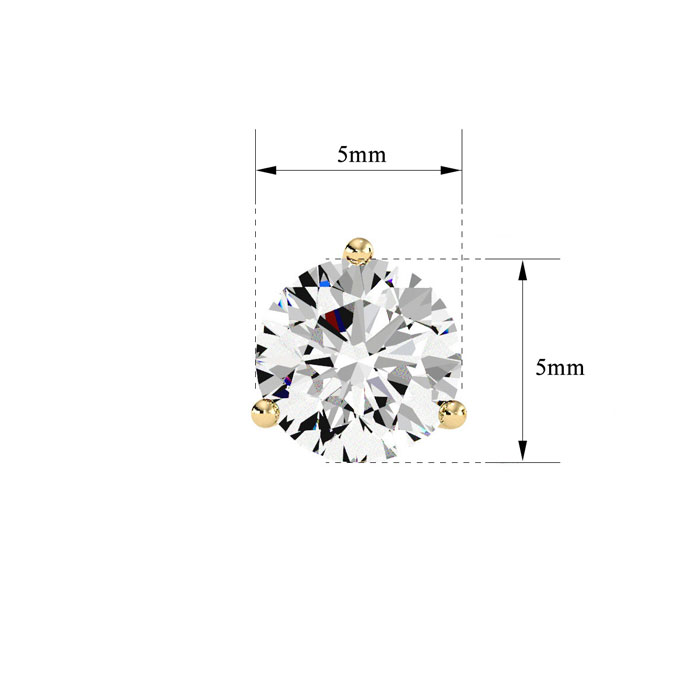 This classic stud earring features one 1/2 carat total weight moissanite in a 14 karat yellow gold martini setting. Earring comes with a friction back. Earring measures approximately 5mm. Moissanite color is E-F and clarity is VVS1-VVS2.