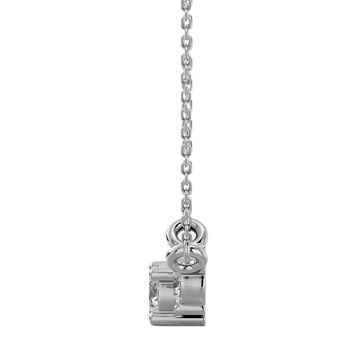 This fabulous moissanite necklace features a sparkling 1/4 carat round shape center moissanite in E-F color, VVS1-VVS2 clarity. It is surrounded by two moissanites each weighing 0.12 carats for a total weight of 1/4 carats. Total carat weight is 1/2 carat. This necklace is in 14 karat white gold and comes with an 18 inch cable chain with a spring-ring clasp.