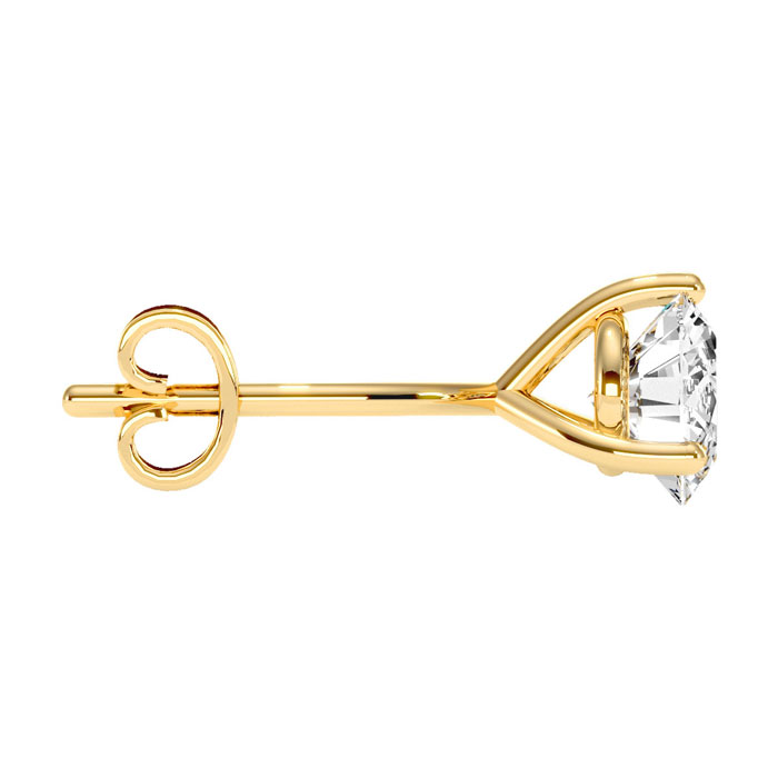 1/2 carat diamond stud earrings in martini setting in 14 karat yellow gold. Diamond color is H-I, diamond clarity I1-I2. Each earring measures 4mm. Earrings have secure post with friction backs.