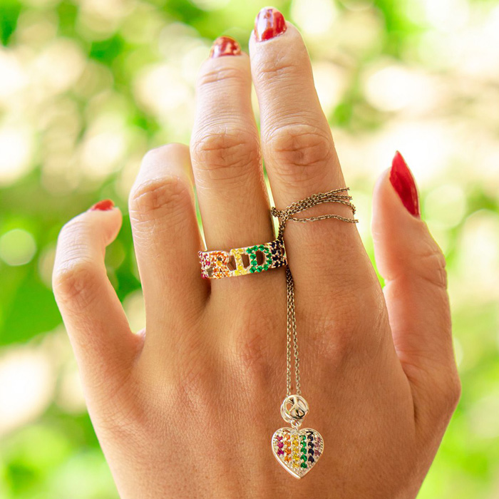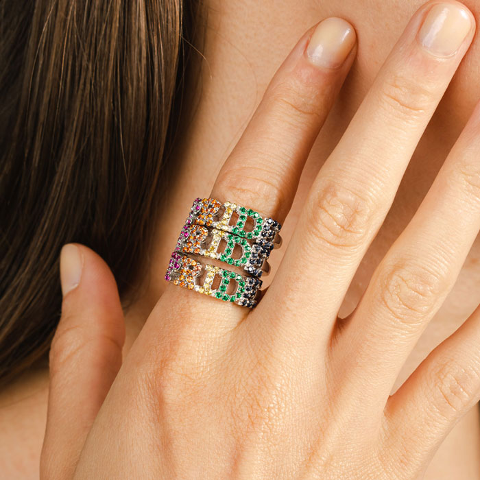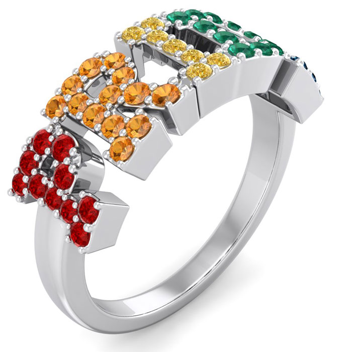 Show your PRIDE with this standout ring! Ideal for women and men, this ring features various created emerald, created sapphire and created ruby gemstones. Total carat weight is 1/2 carat. This ring is in 14 karat white gold.