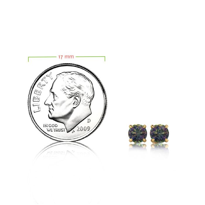 These classic stud earrings feature two 3mm round shape mystic topaz gemstones. Each stone measures approximately 1/4 carat for a total approximate weight of 1/2 carat. These earrings are in 14 karat yellow gold over sterling silver and have comfortable and secure post with friction backs.