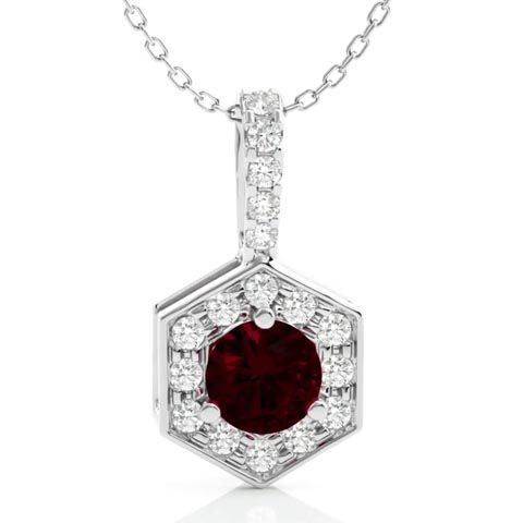 This elegant gemstone and diamond necklace features one center ruby gemstone weighing approximately 1/3 carat. There are 17 side diamonds totaling 1/5 carat. Total carat weight is approximately 1/2 carat. Diamond color is J-K, diamond clarity is I1-I2. This necklace is in 14 karat white gold and comes with an 18 inch cable chain with a spring-ring clasp. The pendant measures 8x8mm in diameter.