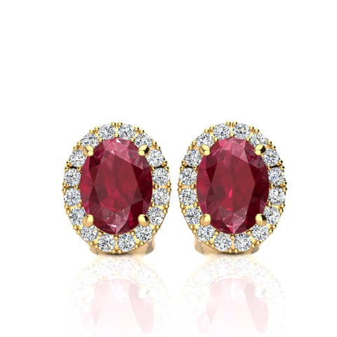 1 1/4 Carat Oval Shape Ruby and Halo Diamond Stud Earrings In 14 Karat Yellow Gold