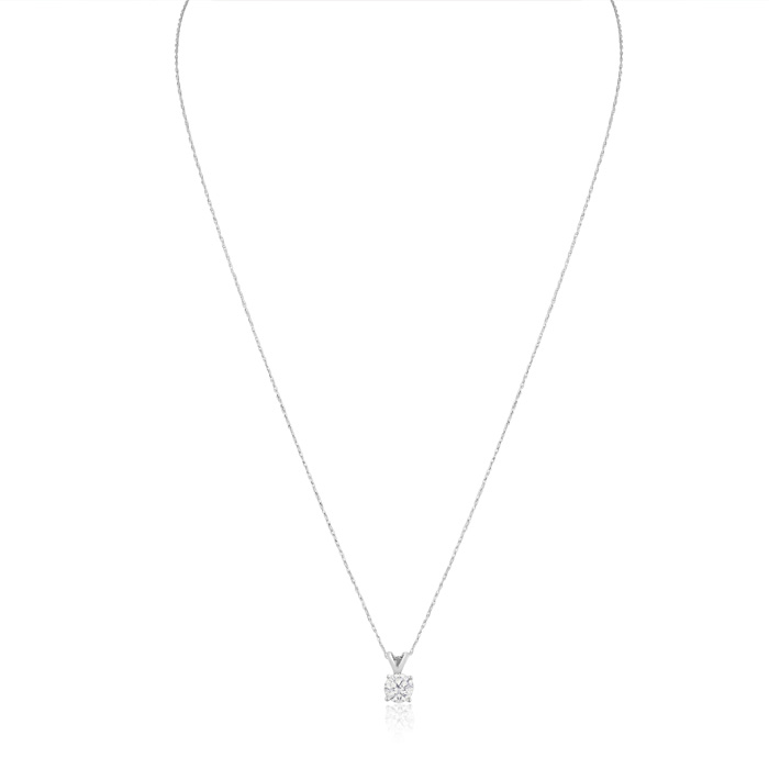 1/2ct White Gold Round Diamond Solitaire Pendant in SuperJeweler's Finest Solitaire Pendant Quality. Our 4 Stars diamonds are G/H Color, SI1/SI2 Clarity, which are top fine white color, extremely brilliant because of our fine cut and totally eye clean. The mounting is a heavy, sturdy 14k gold basket setting, to ensure safe long term wearability. It even comes with a complementary 18-inch chain.