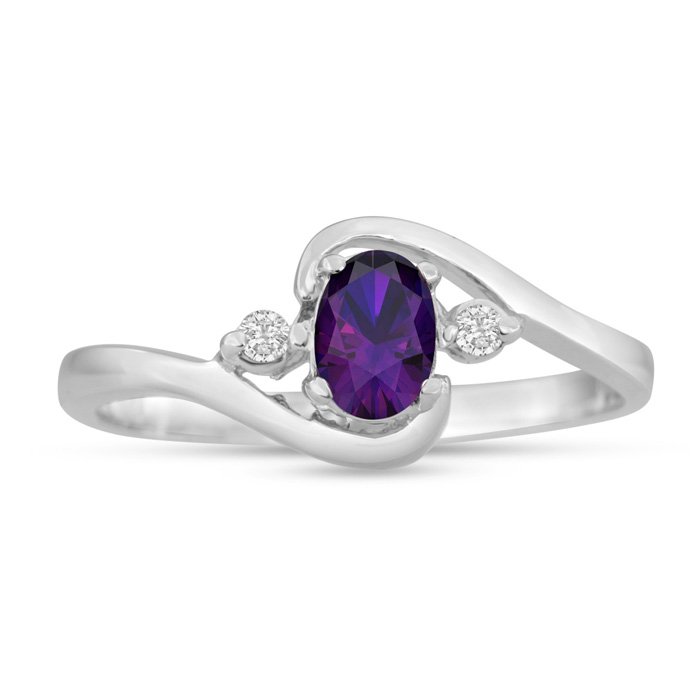 This stunning gemstone and diamond ring features one 5x3mm oval shape amethyst gemstone at 0.43 carats. It is surrounded by 2 sparkling diamonds in a halo in G-H color, I1-I2 clarity at 0.04 carats. Total gem weight is 0.47 carats. This ring is crafted in 14 karat white gold.