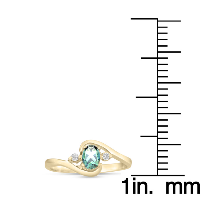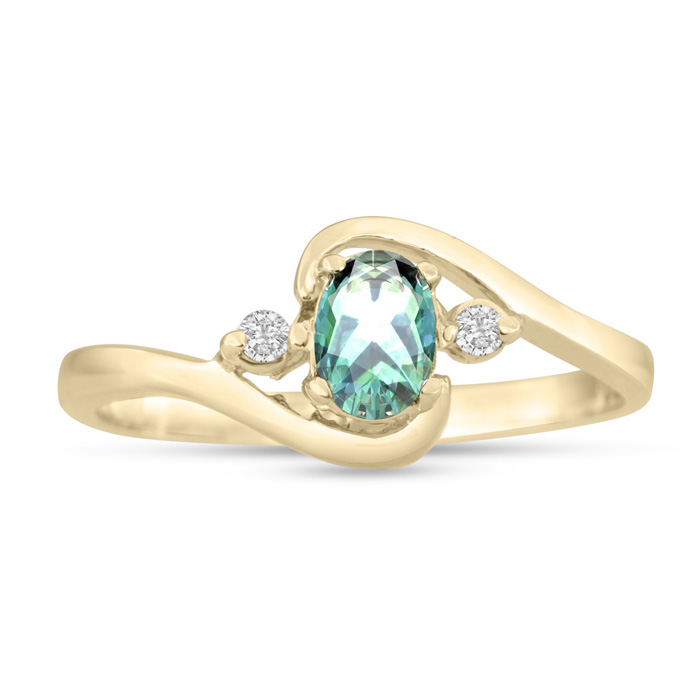 This stunning gemstone and diamond ring features one 5x3mm oval shape green amethyst gemstone at 0.43 carats. It is surrounded by 2 sparkling diamonds in a halo in G-H color, I1-I2 clarity at 0.04 carats. Total gem weight is 0.47 carats. This ring is crafted in 14 karat yellow gold.