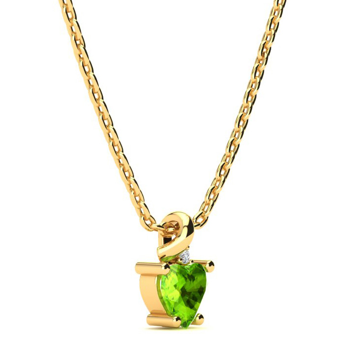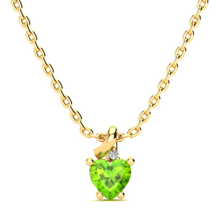 This necklace features one 6mm heart shaped peridot gemstone at approximately 1/2 carat total weight. It is accented with one sparkling diamond in I-J color, I1-I2 clarity. The necklace is in 10 karat yellow gold and comes with an 18 inch cable chain with spring-ring clasp.