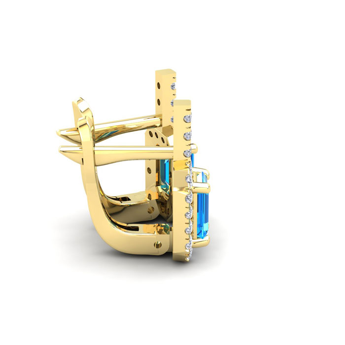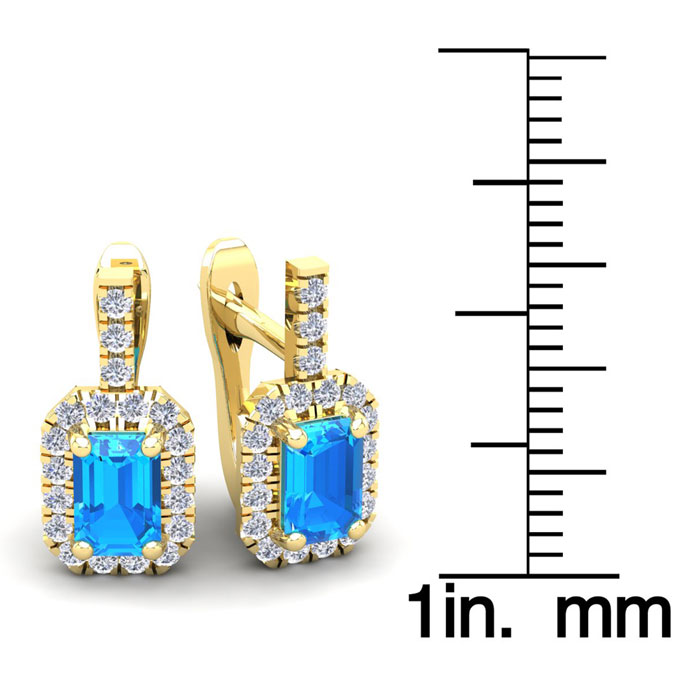 These stunning gemstone and halo diamond earrings feature two 6x4mm emerald cut blue topaz gemstones at 1.34 carats. The gemstones are surrounded by 38 sparkling diamonds in a halo in I-J color, SI2-I1 clarity at 0.48 carats. Total gem weight is 1.82 carats. These earrings are crafted in 14 karat yellow gold and come with comfortable and secure snap backs.