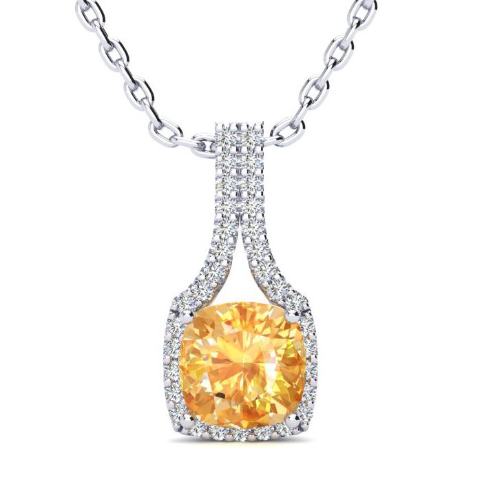 1 3/4 Carat Cushion Cut Citrine and Classic Halo Diamond Necklace In 14 Karat White Gold, 18 Inches