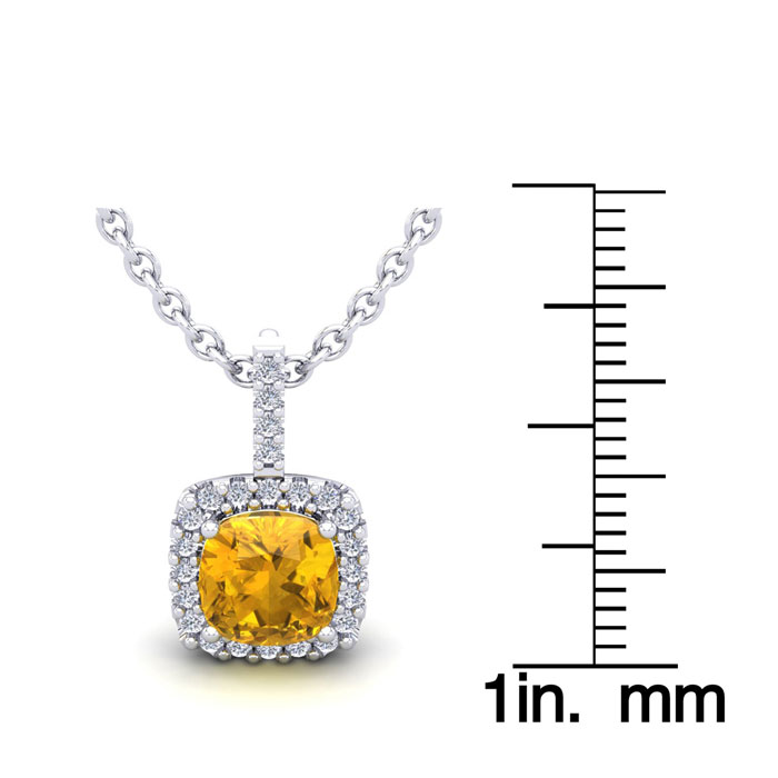 1 3/4 Carat Cushion Cut Citrine and Halo Diamond Necklace In 14 Karat White Gold, 18 Inches