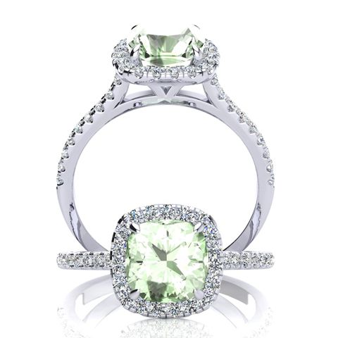 1 3/4 Carat Cushion Cut Green Amethyst and Halo Diamond Ring In 14K White Gold