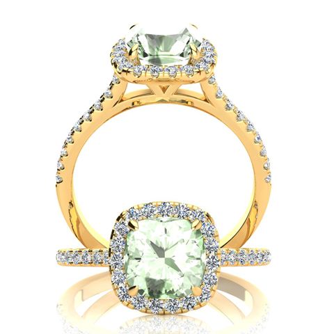 1 3/4 Carat Cushion Cut Green Amethyst and Halo Diamond Ring In 14K Yellow Gold