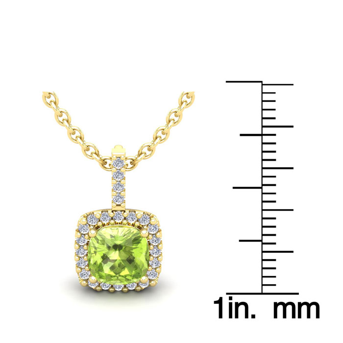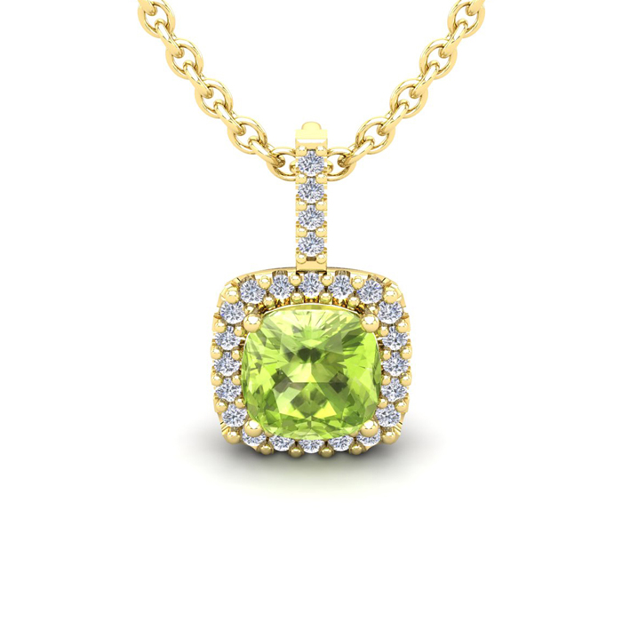 1 3/4 Carat Cushion Cut Peridot and Halo Diamond Necklace In 14 Karat Yellow Gold, 18 Inches
