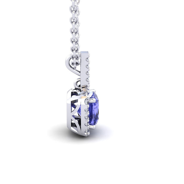 This stunning gemstone and halo diamond necklace features one 7x7mm cushion cut tanzanite gemstone at 1.50 carats. It is surrounded by 24 sparkling diamonds in a halo in I-J color, SI2-I1 clarity at 0.24 carats. Total gem weight is 1.74 carats. This necklace is crafted in 14 karat white gold and comes with an 18 inch cable chain with spring-ring clasp.