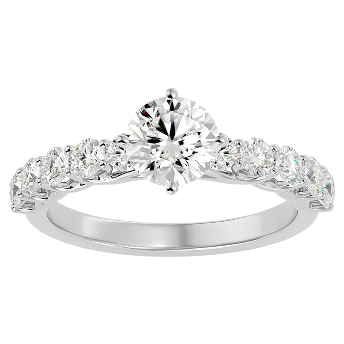 This fabulous diamond engagement ring features a sparkling 1 carat round shape center diamond in H-I color, SI2-I1 clarity. It is surrounded by 10 side diamonds totaling 3/4 carat. Total carat weight is 1 3/4 carats. This ring is in 14 karat white gold.