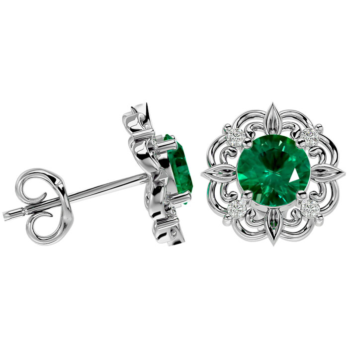 These elegant gemstone earrings feature two 6mm emerald gemstones at approximately 1.60 carats. They are surrounded by 8 sparkling diamonds in I-J color, I1-I2 clarity at 1/10 carat total weight. Total gem weight is approximately 1.70 carats. These earrings are in 14 karat white gold and have comfortable and secure friction backs.