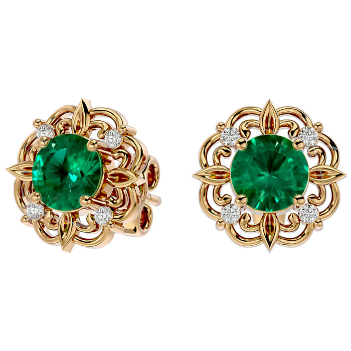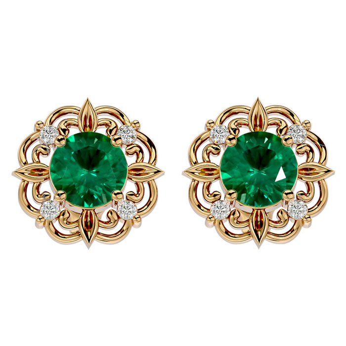 Retrograde Birthstones™ 1 3/4 Carat Emerald and Diamond Antique Stud Earrings In 14 Karat Yellow Gold