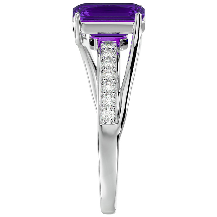 This elegant gemstone ring features one 8x6mm emerald shape amethyst gemstone at approximately 1 1/2 carats. It is surrounded by 14 sparkling diamonds in I-J color, I1-I2 clarity at 1/5 carat total weight. Total gem weight is approximately 1 3/4 carats. This ring is in 14 karat white gold.