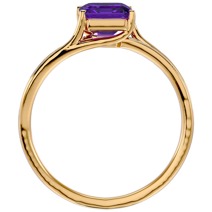 This elegant gemstone ring features one 8x6mm emerald shape amethyst gemstone at approximately 1 1/2 carats. It is surrounded by 14 sparkling diamonds in I-J color, I1-I2 clarity at 1/5 carat total weight. Total gem weight is approximately 1 3/4 carats. This ring is in 14 karat yellow gold.