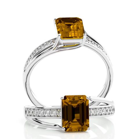1 3/4 Carat Emerald Shape Citrine and Diamond Ring In 14 Karat White Gold