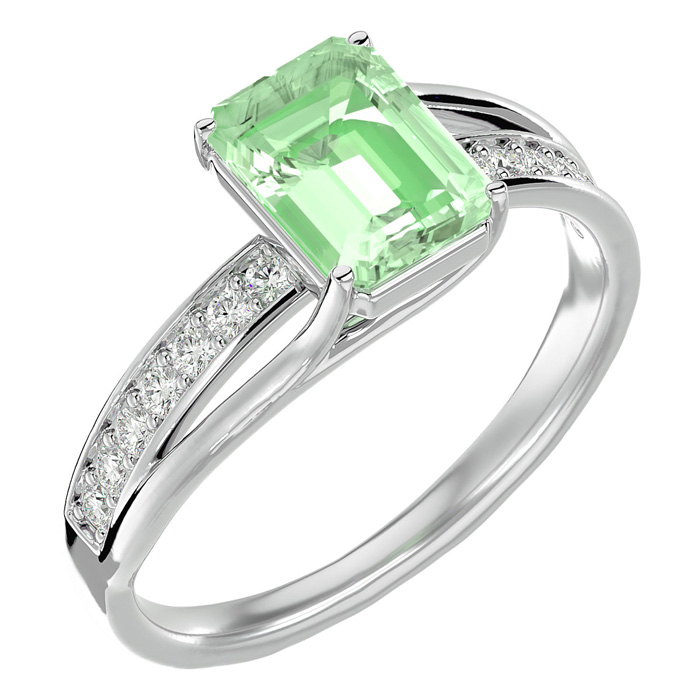 This elegant gemstone ring features one 8x6mm emerald shape green amethyst gemstone at approximately 1 1/2 carats. It is surrounded by 14 sparkling diamonds in I-J color, I1-I2 clarity at 1/5 carat total weight. Total gem weight is approximately 1 3/4 carats. This ring is in 14 karat white gold.