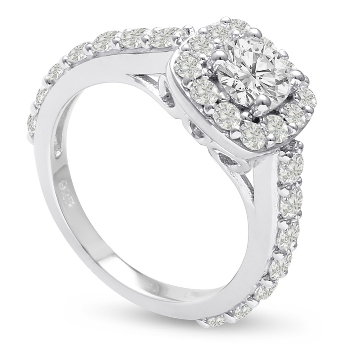 This is a uinque halo style ring with a sqare halo setting that has been rounded out around the edges, the intricate detailed curls on the side of the band are also a nice touch!