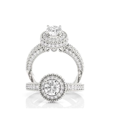 This fabulous engagement ring features a sparkling 3/4 carat clarity enhanced center diamond in I-J color, I1-I2 clarity. It is surrounded by a halo of 86 side diamonds totaling 1 carat. Total carat weight is 1 3/4 carats. This ring is in 14 karat white gold.