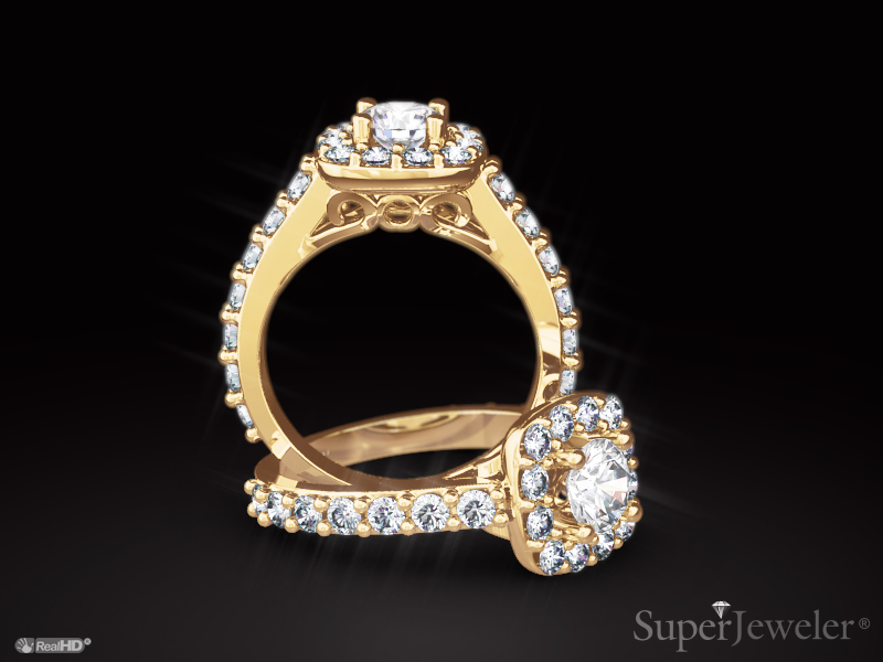 For a classically beautiful diamond engagement ring, try this engagement ring crafted in 14 karat yellow gold. This ring boasts a 3/4 carat clarity enhanced center diamond surrounded by a halo of diamonds. The ring has a total diamond weight of 1.72 carats. There are 27 diamonds total in I-J color and I1-I2 clarity.