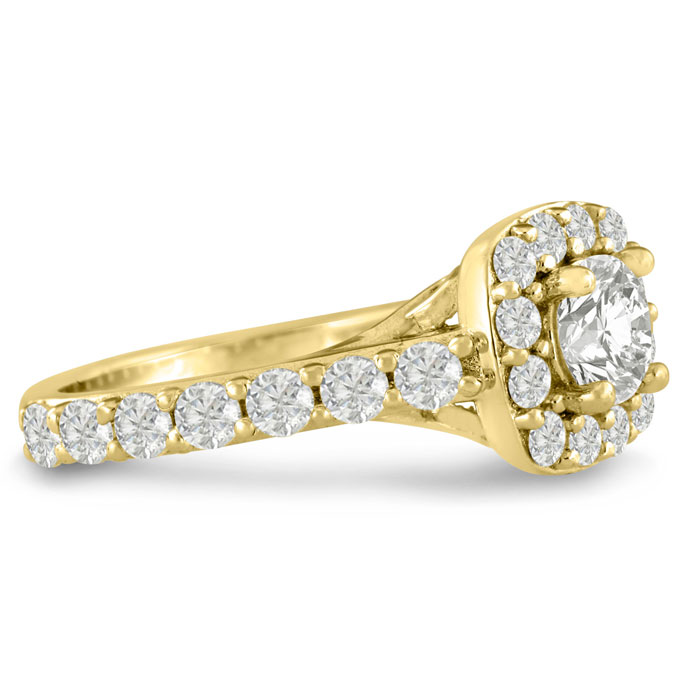 For a classically beautiful diamond engagement ring, try this engagement ring crafted in 14 karat yellow gold. This ring boasts a 3/4 carat clarity enhanced center diamond surrounded by a halo of diamonds. The ring has a total diamond weight of 1.72 carats. There are 27 diamonds total in I-J color and I1-I2 clarity.