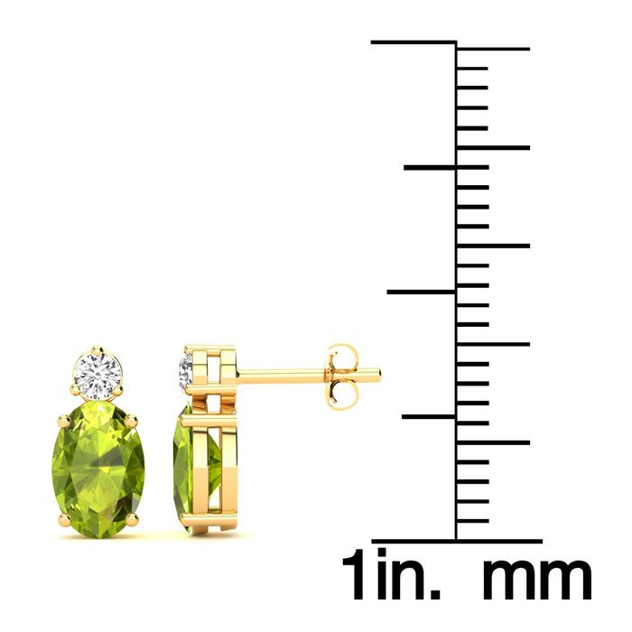 These stunning gemstone and diamond earrings feature two 7x5mm oval shape peridot gemstones at 1.80 carats. The gemstones are accented with two sparkling diamonds in a in I-J color, SI2-I1 clarity at 0.06 carats. Total gem weight is 1.86 carats. These earrings are crafted in 14 karat yellow gold and come with comfortable and secure post with friction backs.