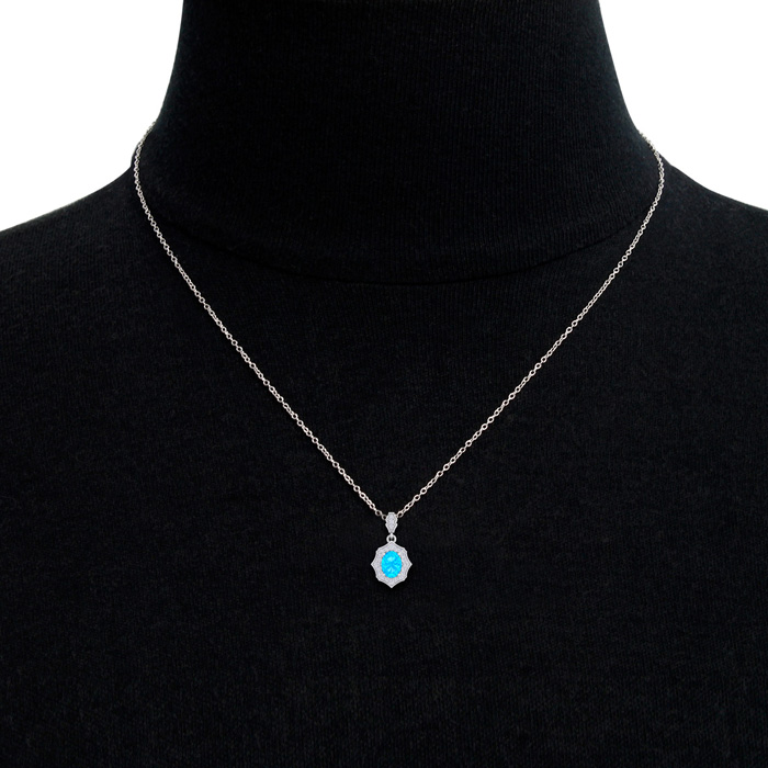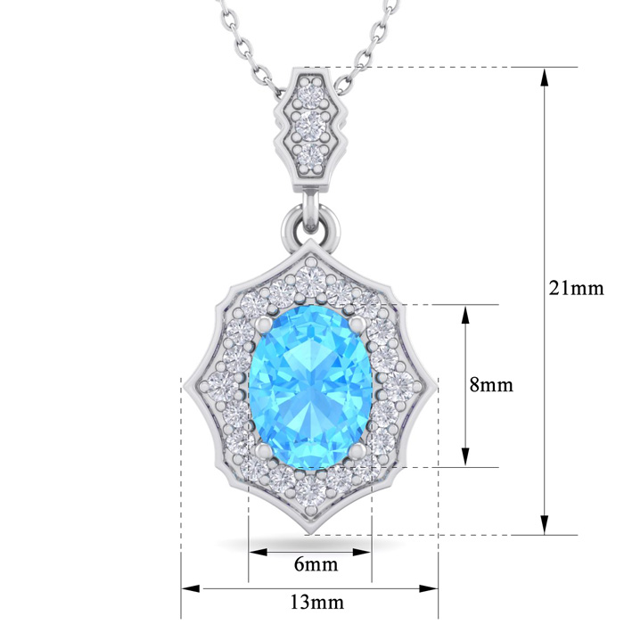 This elegant gemstone necklace features one 8x6mm oval shape blue topaz gemstone at approximately 1 1/2 carats. It is surrounded by 23 sparkling diamonds in I-J color, I1-I2 clarity at 1/4 carat total weight. Total gem weight is approximately 1 3/4 carat total weight. This necklace is in 14 karat white gold and comes with an 18 inch cable chain with a spring ring clasp. The pendant is approximately 3/4 inch long.