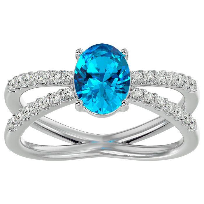 1 3/4 Carat Oval Shape Blue Topaz and Diamond Ring In 14 Karat White Gold