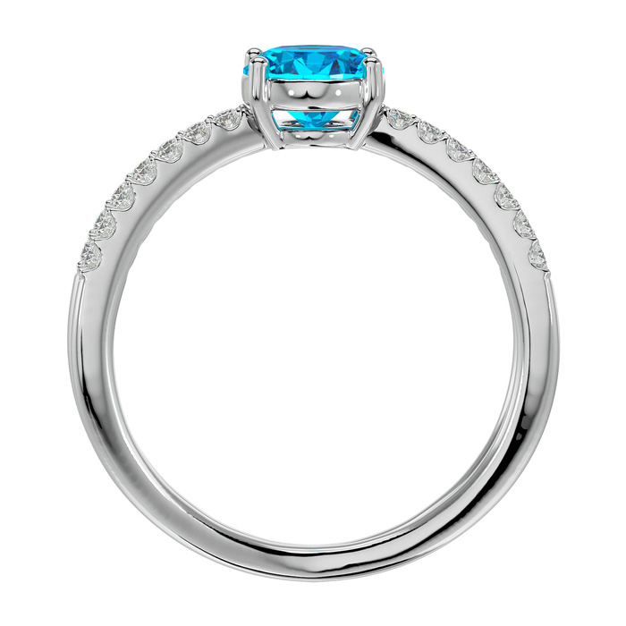 This elegant gemstone ring features one 8x6mm oval shape blue topaz gemstone at approximately 1 1/2 carats. It is surrounded by 28 sparkling diamonds in I-J color, I1-I2 clarity at 1/4 carat total weight. Total gem weight is approximately 1 3/4 carats. This ring is in 14 karat white gold.