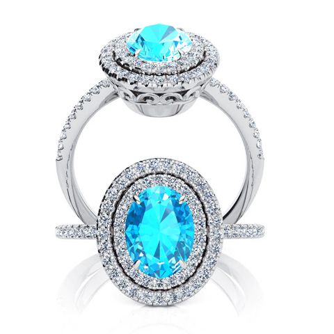 1 3/4 Carat Oval Shape Blue Topaz and Double Halo Diamond Ring In 14 Karat White Gold