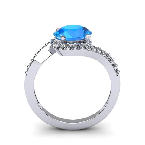 This stunning gemstone and diamond ring features one 8x6mm oval shape sideways blue topaz gemstone at 1.50 carats. It is surrounded by 30 sparkling diamonds in a halo in I-J color, I1-I2 clarity at 0.30 carats. Total gem weight is 1.80 carats. This ring is crafted in 14 karat white gold.