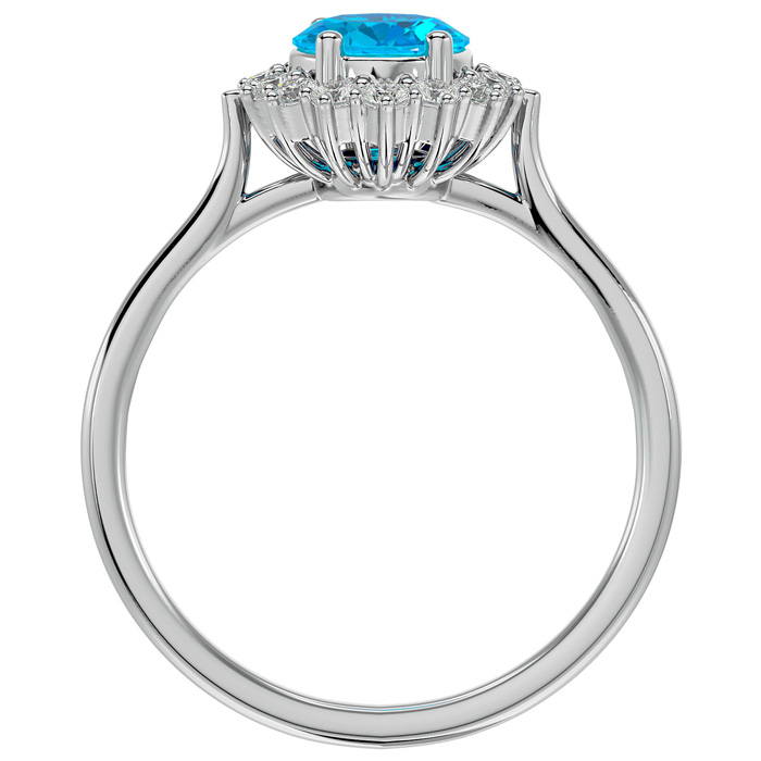 This elegant gemstone ring features one 8x6mm oval shape blue topaz gemstone at approximately 1 1/2 carats. It is surrounded by 16 sparkling diamonds in I-J color, I1-I2 clarity at 1/4 carat total weight. Total gem weight is approximately 1 3/4 carats. This ring is in 14 karat white gold.